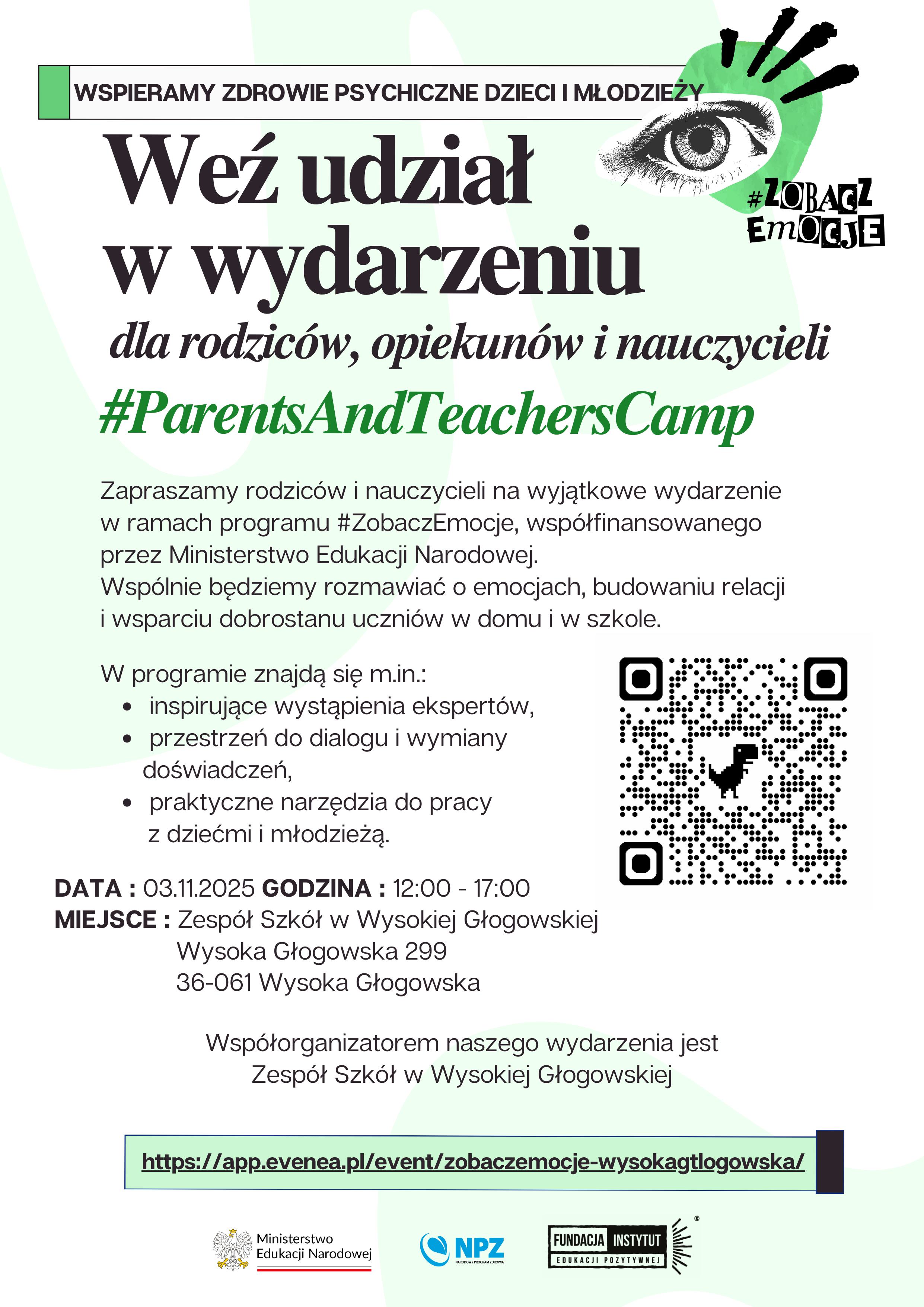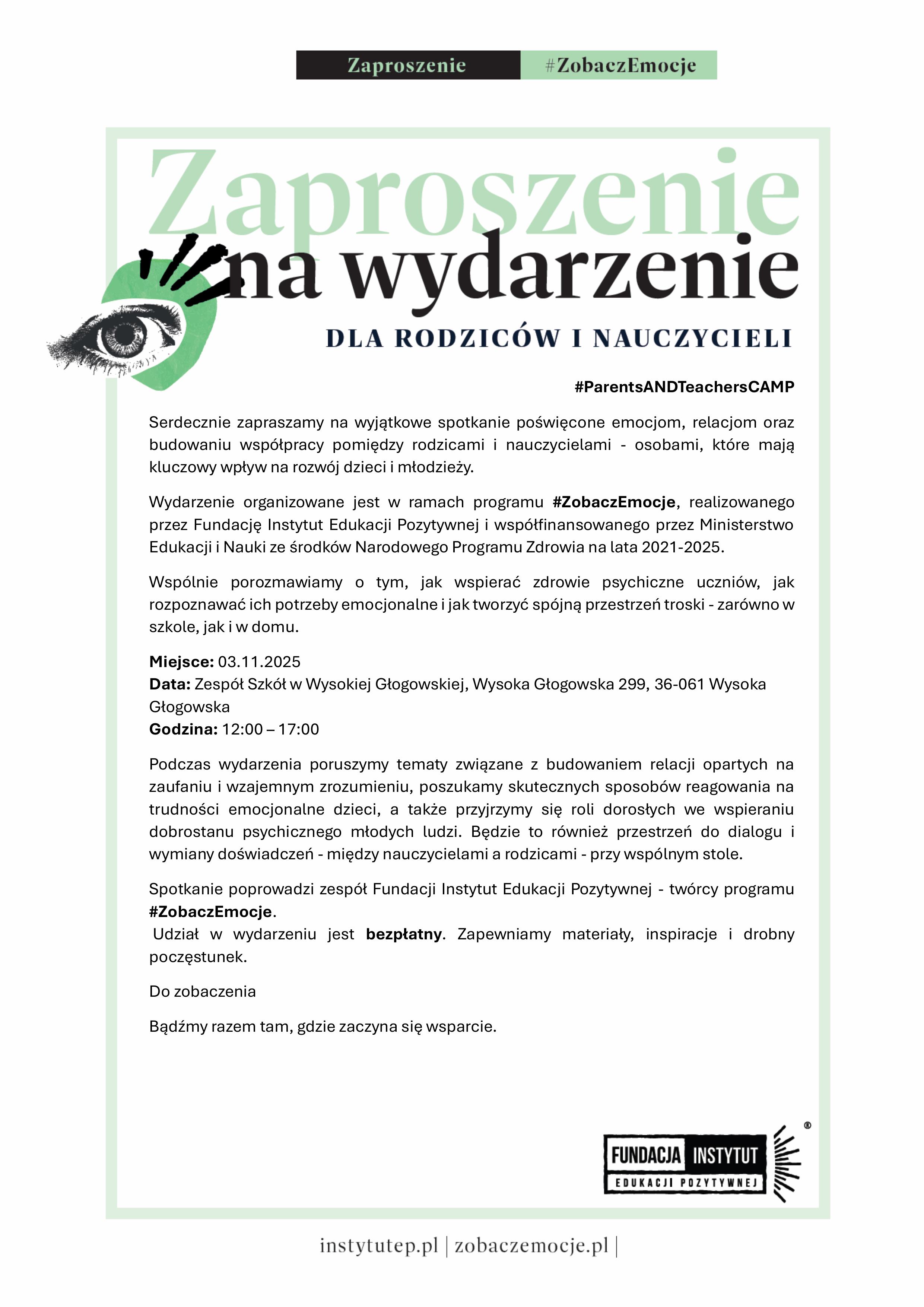 serdecznie zapraszamy Was do udziału w wyjątkowym wydarzeniu #ParentsANDTeachersCAMP, które odbędzie się w ramach programu #ZobaczEmocje, współfinansowanego przez Ministerstwo Edukacji Narodowej, w naszej szkole 03.11.2025 ( szczegóły w zaproszeniu).