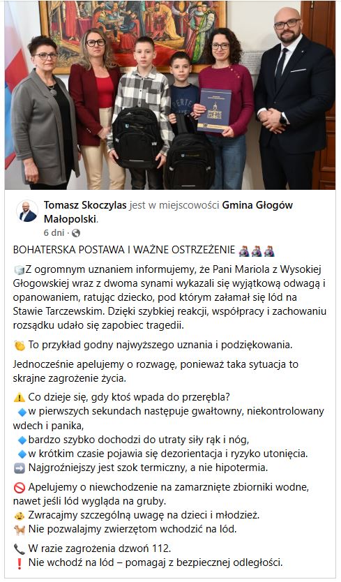 Podczas spotkania Pani Dyrektor pogratulowała odwagi naszej nauczycielce Pani Marioli, która wraz z dwoma synami z wyjątkową odwagą i opanowaniem, uratowała dziecko, pod którym załamał się lód na Stawie Tarczewskim w Głogowie Młp. Dzięki szybkiej reakcji, współpracy i zachowaniu rozsądku udało się zapobiec tragedii.